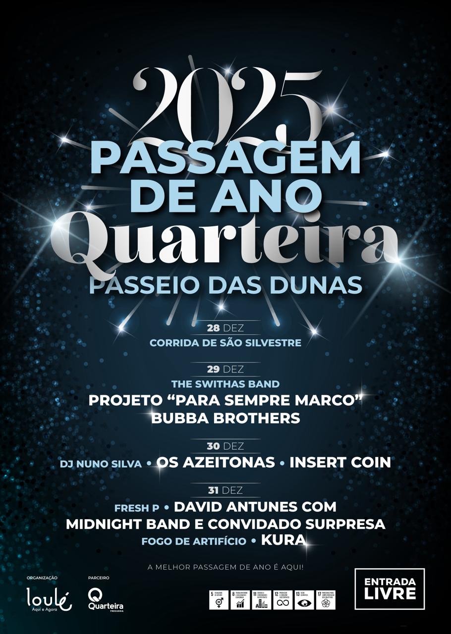 A Câmara Municipal de Loulé já prepara a tradicional Passagem de Ano em Quarteira e este ano a aposta musical passa por nomes como os Azeitonas, David Antunes ou DJ Kura. Mais uma vez, o programa de celebrações estende-se por quatro dias e pretende proporcionar um ponto de atração para quem se encontra na região nesta altura do ano.